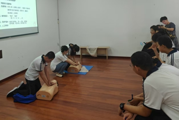 在会场设置实操技能培训,学生以3-4人为一组,在救护师和校医的指导下,进行心肺复苏实操,救护师逐人纠正动作,确保操作规范。