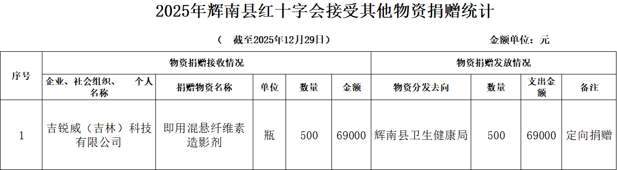 截至2025年12月29日24时,辉南县红十字会累计接受社会捐赠物资1笔,价值6.9万元。捐赠物资均按照捐赠人的意愿调配发放完毕。