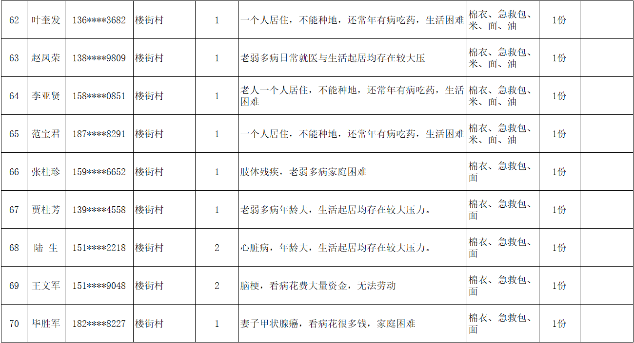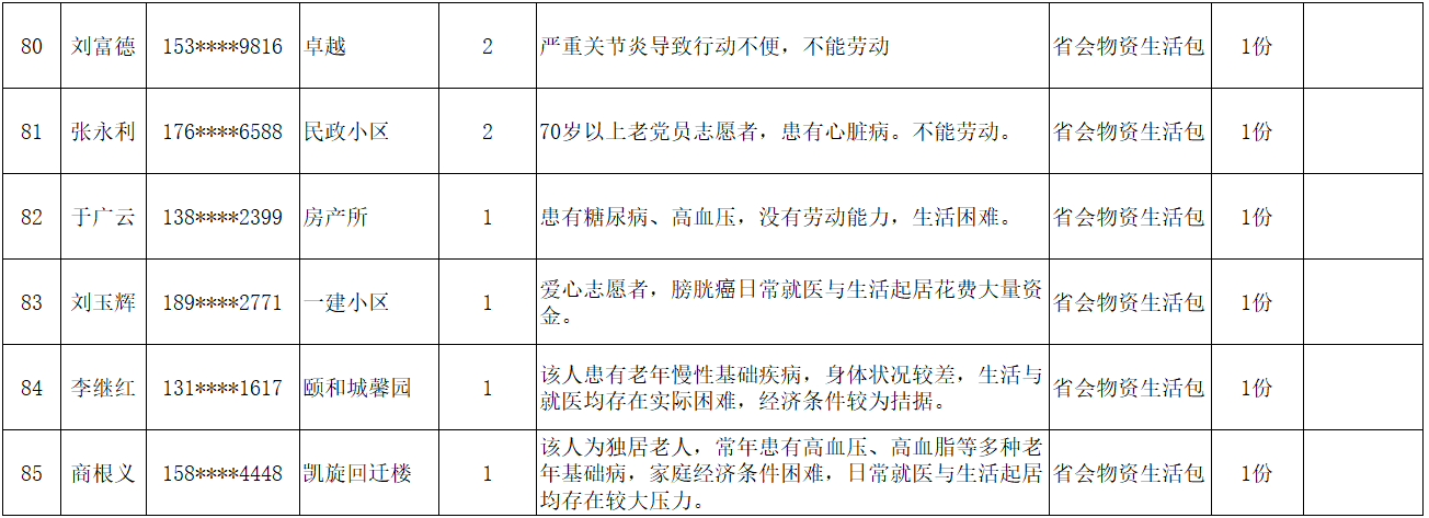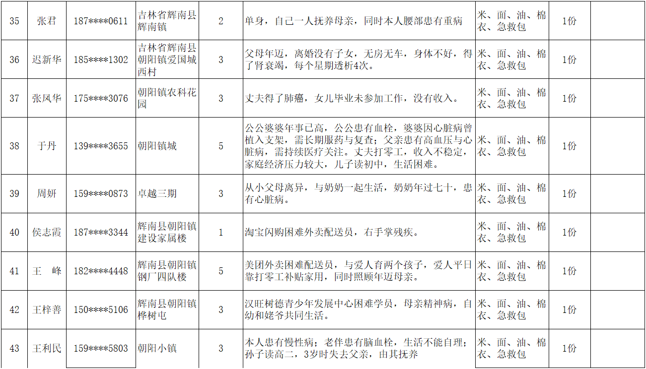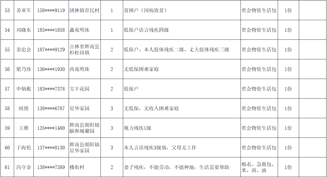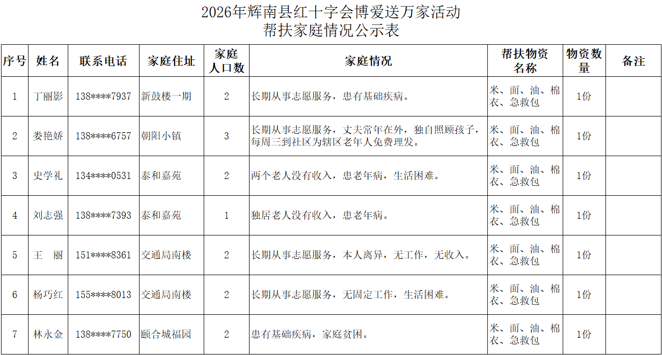 为弘扬“人道、博爱、奉献”的红十字精神,充分发挥红十字会作为党和政府在人道领域的助手和联系群众的桥梁纽带作用,根据总会和省红十字会《吉林省红十字会2026年度“红十字博爱送万家”活动方案的通知》文件精神,辉南县红十字会在2026年春节前夕组织开展“博爱送万家”活动。经研究同意,拟对85名困难群众给予人道救助。现将救助人员基本情况和发放物资情况予以公示。