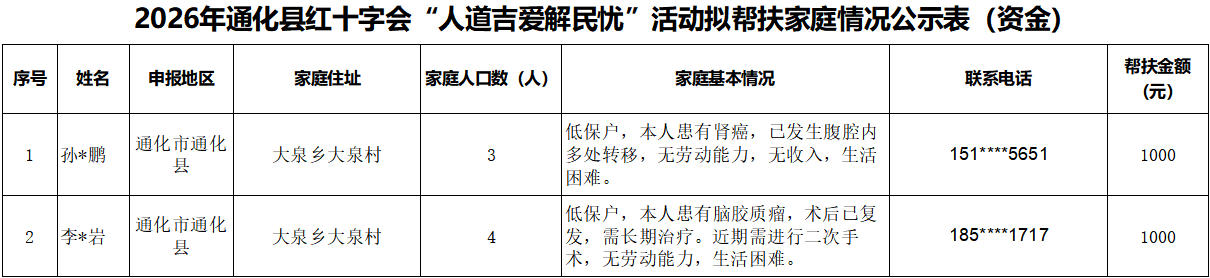 附件:2026年通化县红十字会“人道吉爱解民忧”活动拟帮扶家庭情况公示表